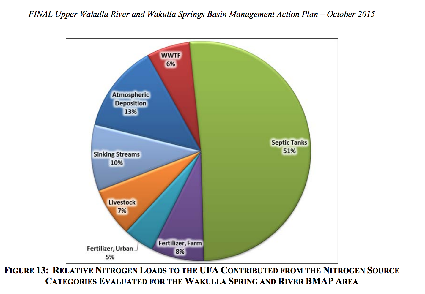 Florida’s Springs: Intensive studies of springsheds such as Wakulla Springs have shown that septic systems have become a major, and in many cases the major, source of nitrogen pollution. For Example, a recent study by FDEP showed that 51% of the nitrogen loading causing algae blooms in Wakulla Springs is from septic systems. Similar studies in Silver Springs have shown that Septic systems are contributing 40% of the nitrogen loads.