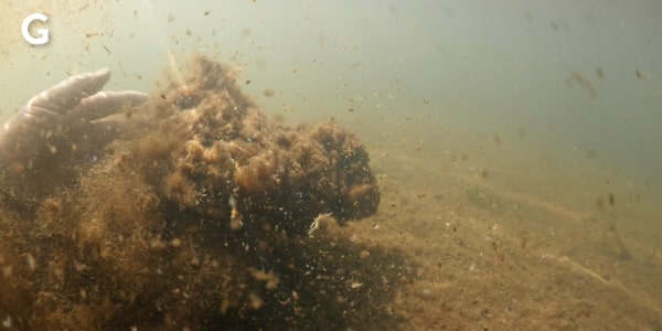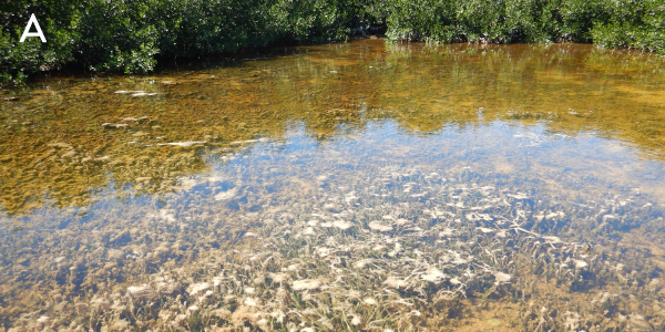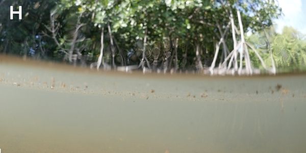 Still images from the transect provided additional evidence that a buoyant groundwater plume from the shallow injection well is discharging along this coastline, resulting in contamination with nutrients and other wastewater pollutants. The first image at the offshore end of the transect (Fig. A) showed turtle grass (Thalassia testudinum) blades with heavy epiphyte loads, characteristic of nutrient-impacted waters. Moving closer to shore along the transect blooms of fine, filamentous red macroalgae and calcified green macroalgae (Halimeda sp., Penicillus sp.) became abundant, providing additional evidence of nutrient enrichment (Fig. B). Thick blooms of filamentous red macroalgae and calcified green macroalgae continued along the transect (Fig. C, D, and E); the macroalgae included scattered mounds of the green seaweed Avrainvillea nigricans f. spongiosa, a form of macroalgae associated with nutrient-rich habitats in the interior of mangrove lakes. Within 10 meters of shore, the benthos changed markedly to a thick brown, organic-rich detritus (Fig. F, G) and the water became turbid and discolored with a greyish tint (Fig. H). Little, if any, seagrass or macroalgae were present in this inshore zone and the surface water was noticeably cooler than the water on the bottom. These observations suggest a buoyant plume from submarine discharge of cooler groundwaters along the mangrove fringe at Crane Point Hammock.