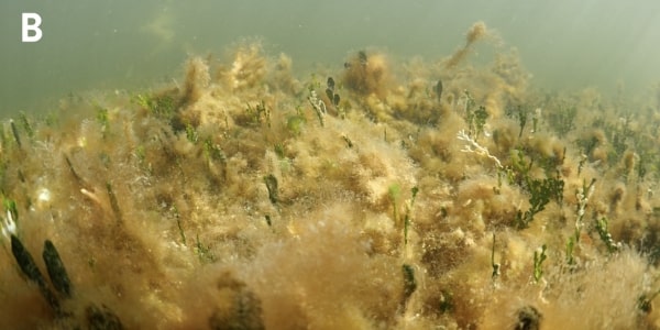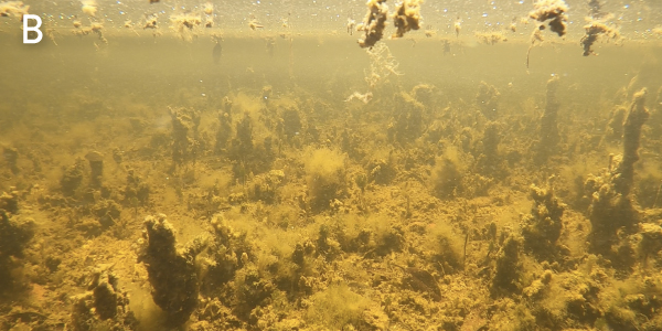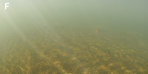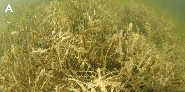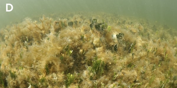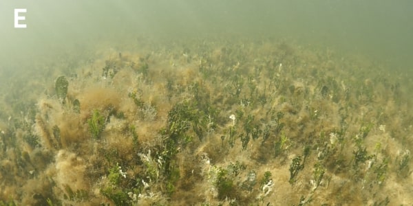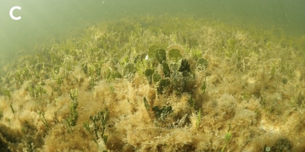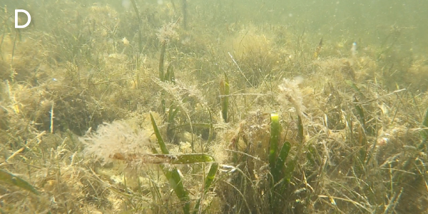 Still imagery along the sucralose sampling transect on March 1, 2022 provided further evidence of wastewater impacts. The first image at the inshore end of the transect near the mangrove fringe had very high sucralose concentrations and showed heavy harmful epiphytic algal overgrowth of the benthic communities comprised of the tropical seagrass Thalassia testudinum (turtle grass) and calcified green alga Penicillus capitatus (Fig. A, B); this is symptomatic of an unhealthy nutrient-enriched, hypereutrophic environment.