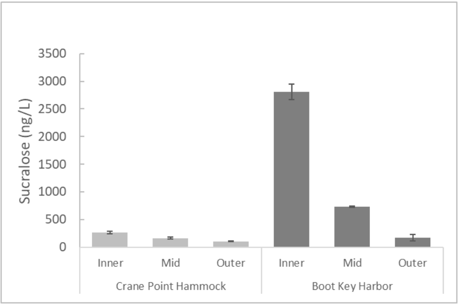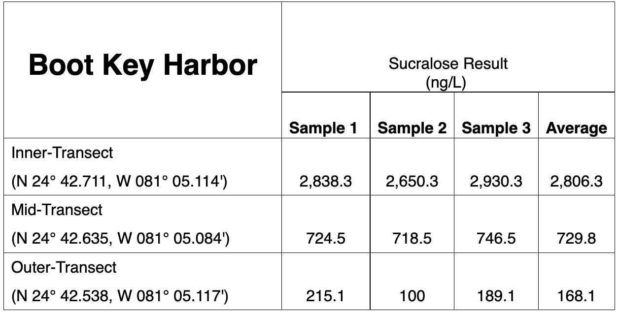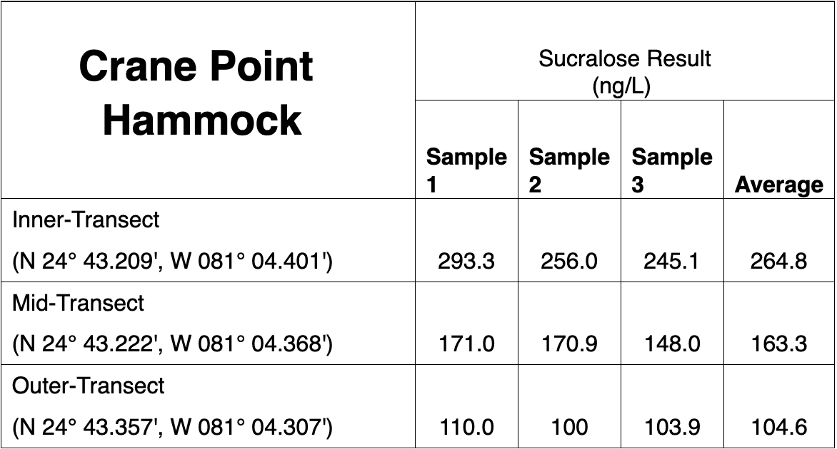 The Crane Point Hammock transect data included in Table 2 below also shows the presence of substantial amounts of sucralose, but at lower concentrations that at Boot Key Harbor.