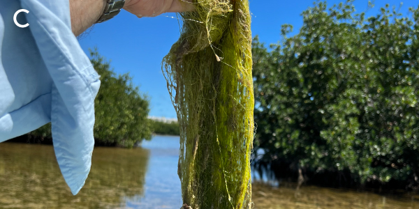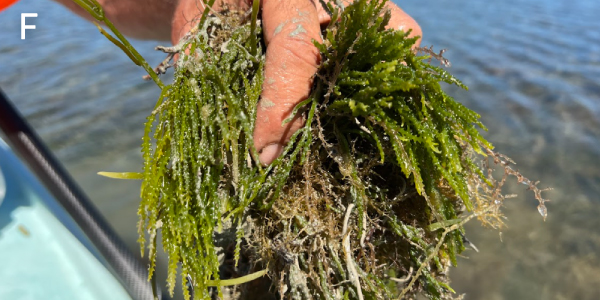 The macroalgal blooms present along this transect included the nutrient pollution indicator species of green seaweed Chaetomorpha gracilis (Fig. C). Further from shore and closer to moored boats in Boot Key Harbor, the shallow turtle grass communities had lower sucralose concentrations but still had heavy algal epiphyte loads (Fig. D) and macroalgal blooms of the red nutrient indicator species Hypnea spinella (Fig. E) and the green rhizomatous seaweed Caulerpa cupressoides (Fig. F). The sampling transect ended at upper Boot Key Harbor Channel, which had numerous moored boats and the lowest sucralose concentrations along the transect. This spatial pattern indicates that the source of sucralose is near the mangrove fringe where a suspected plume from a nearby wastewater treatment facility may be located. There is clearly a greater degree of imbalance in the flora located at the inner site of Boot Key Harbor when compared to similar areas in nearshore waters of the Florida Keys not so heavily impacted by human wastewater.